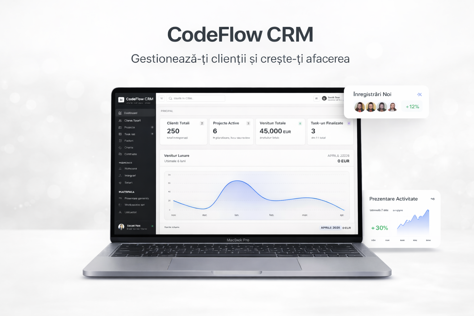 CodeFlow CRM ține împreună clienții, proiectele, taskurile, ofertele, contractele și facturile — fără Excel-uri, foldere haotice sau aplicații separate.