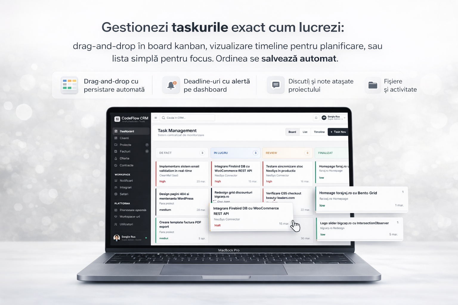 Board, list, timeline view. Drag-and-drop, status tracking și deadline-uri clare.